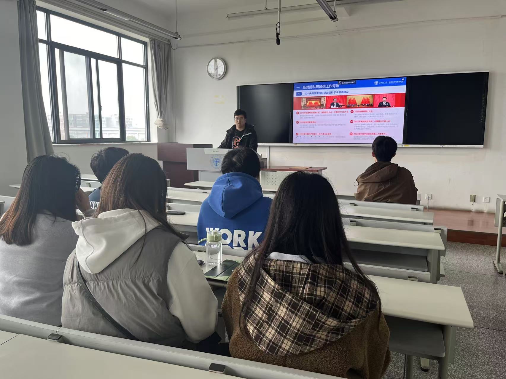 为响应党的二十届三中全会号召,弘扬科学家精神、强化学术诚信的背景下,2024年11月18日,在犀浦校区X8533教室举办了一场以“共筑学术诚信”主题宣讲活动。此次活动由钱秋凡老师主讲,本科2021级班长参与,共同探讨了新时代青年在学术诚信方面的责任与担当。